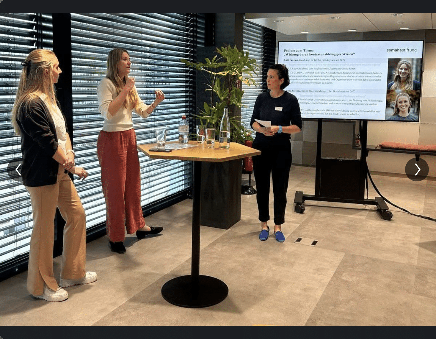 Following the presentation on the new focus topic, a panel discussion took place with Camille Accolas from Brainforest and Joëlle Spahni from AsyLex Global. They shared insights into their work and discussed the opportunities and challenges of impact measurement. It became clear how important it is to develop new approaches to tackle complex problems while at the same time preparing knowledge in such a way that it can also be transferred to other areas.